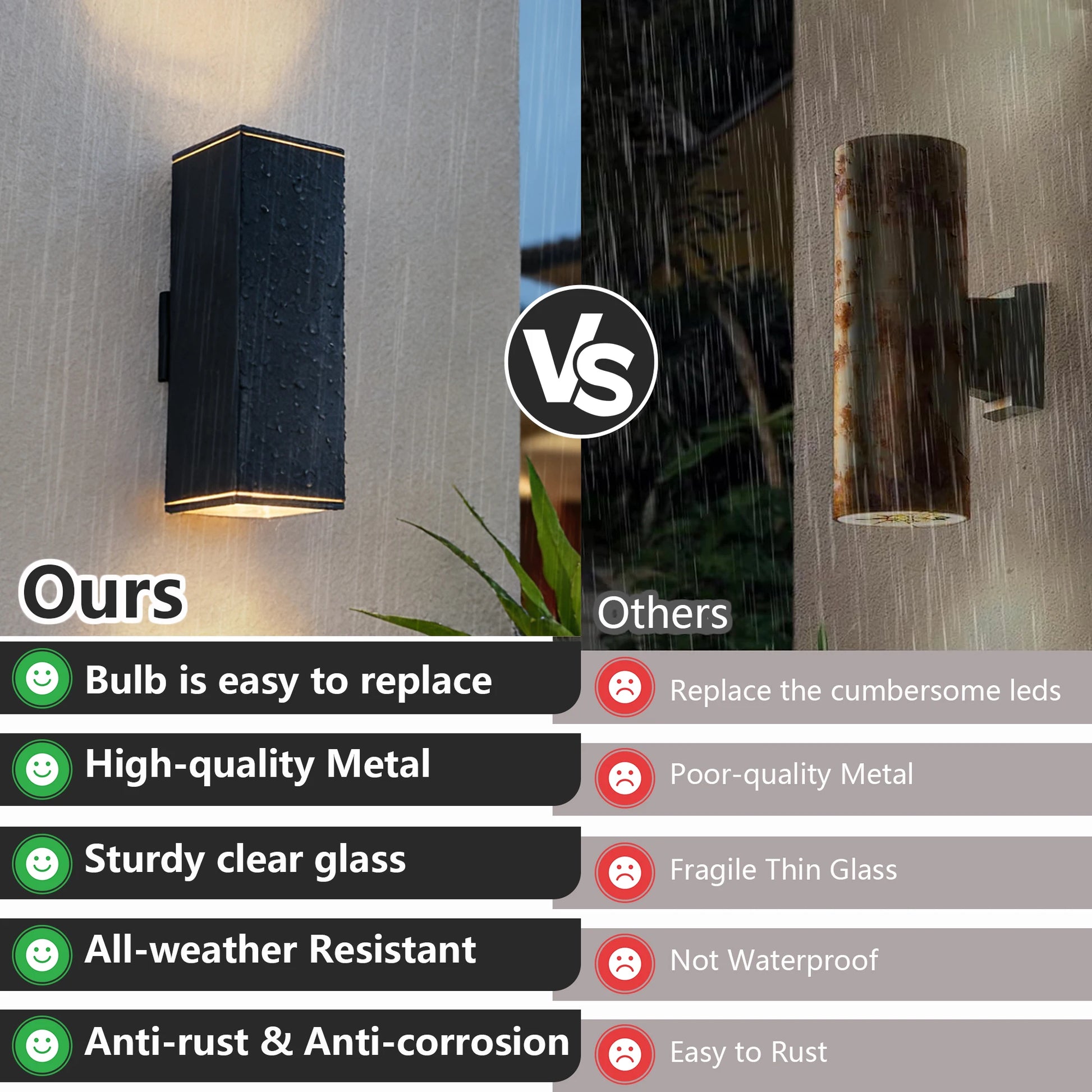 √Modern black square appearance. this modern outdoor sconce features a simple square design with up and down glass covers and a matte black finish. it's a great choice as an exterior wall lamp for decorating your home in any location.