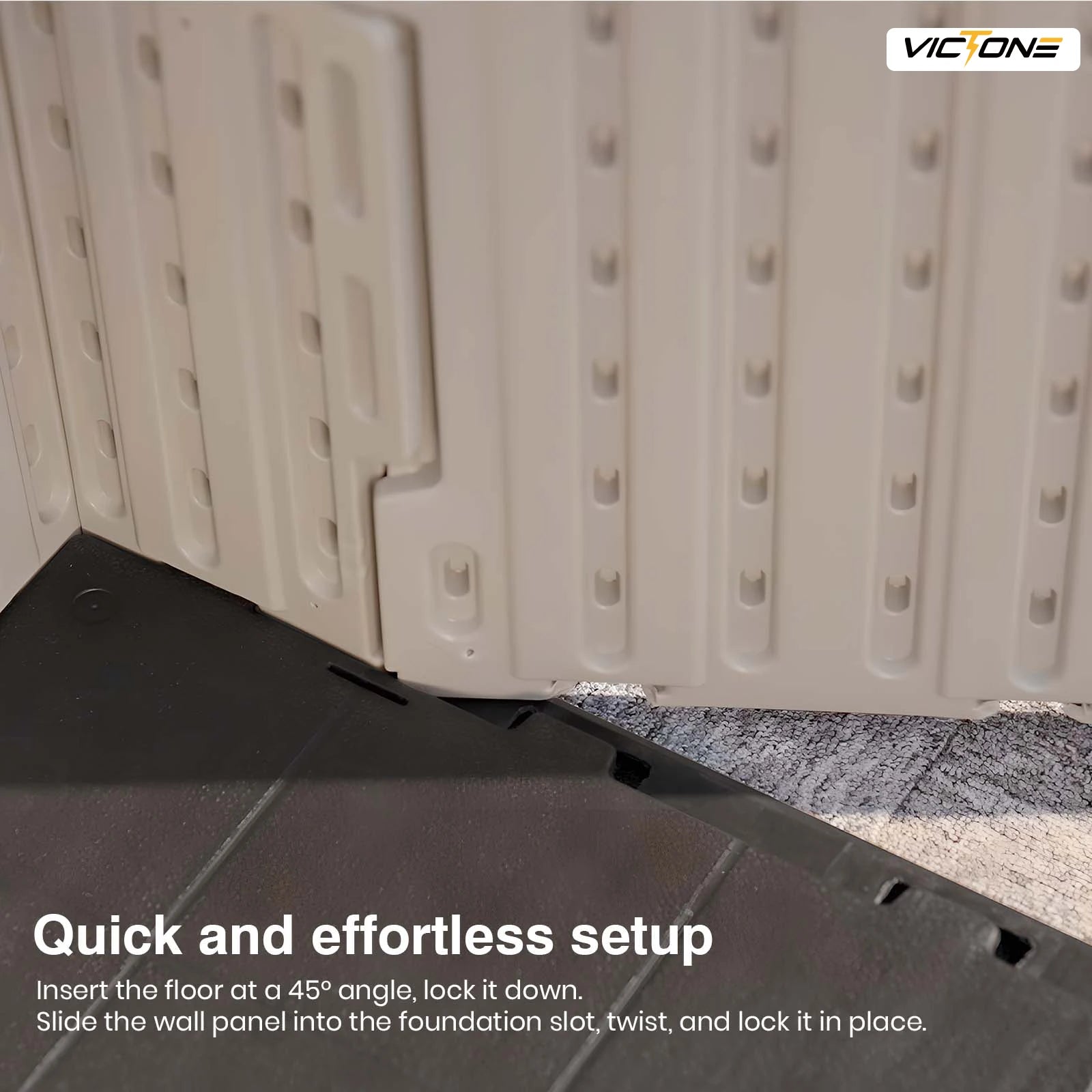 Interesting “Kick-it” Installation Process,This shed reduces the number of screws needed by 35%, making assembly quicker and easier. * When installing wall panels with a kicking action, press firmly downwards to ensure the bottom of the wall panel fully inserts into the ground slots. As shown in the video, once the bottom of the wall panel aligns perfectly with the ground, proceed with the kicking action.